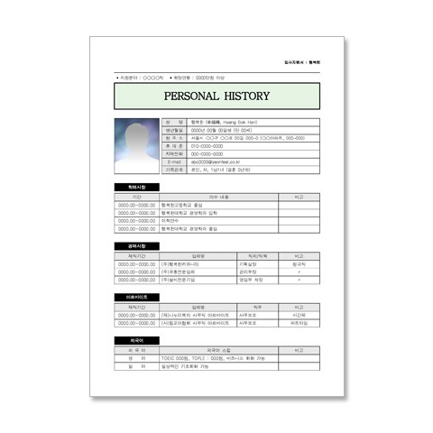 Page1 : 이력서 PERSONAL HISTORY (앞) Page2 : 이력서 PERSONAL HISTORY (뒤) Page3 : 경력기술서 PROFESSIONAL EXPERIENCE - 전 직장에서의 주요 경력을 표현할 수 있는 주요 경력 요약 Page4 : 자기소개서 SEFL-INTRODUCTION (앞) - 본인만의 스토리를 작성할 수 있는 자기소개서 양식 Page5 : 자기소개서 SEFL-INTRODUCTION (뒤) - 본인만의 스토리를 작성할 수 있는 자기소개서 양식